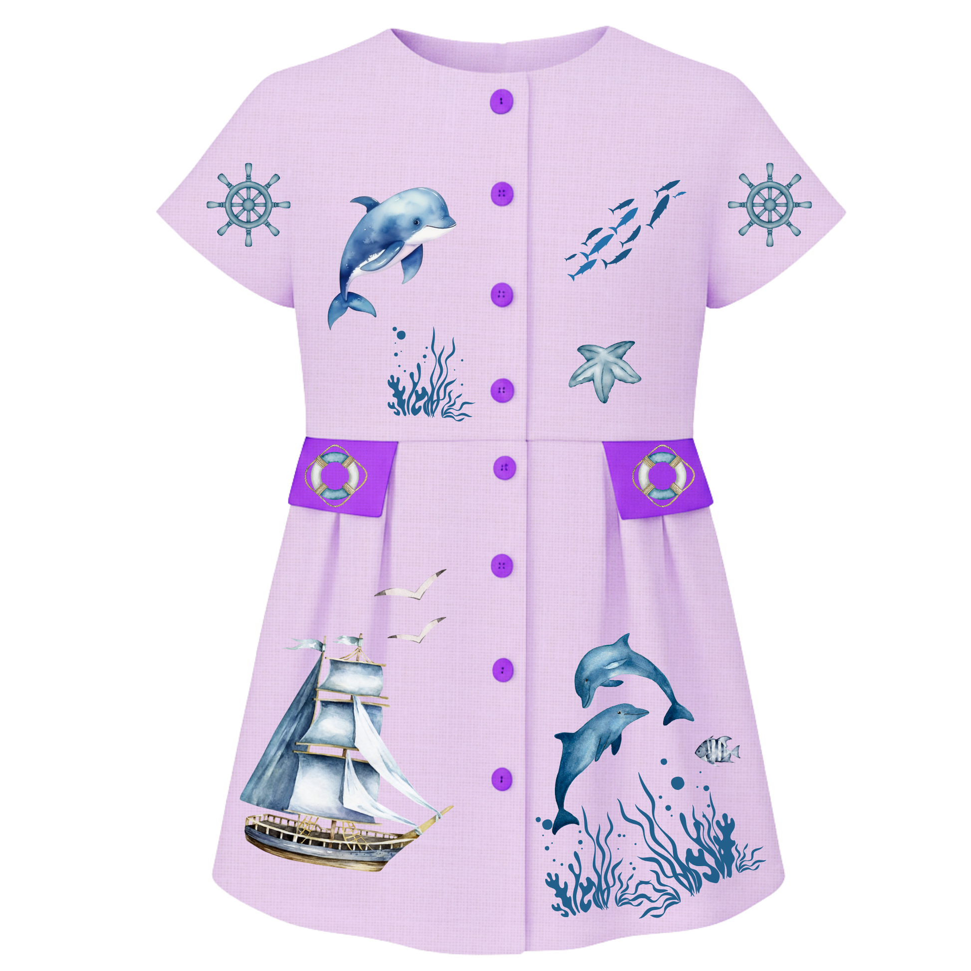 Un abito in puro lino pensato per le bambine che amano il mare, la natura e la leggerezza delle giornate estive. Le illustrazioni marine — delfini, coralli, una stella marina e una nave a vela — sono realizzate in stile acquerello e impreziosite da delicati elementi ricamati, creando un effetto raffinato e ricco di dettagli.