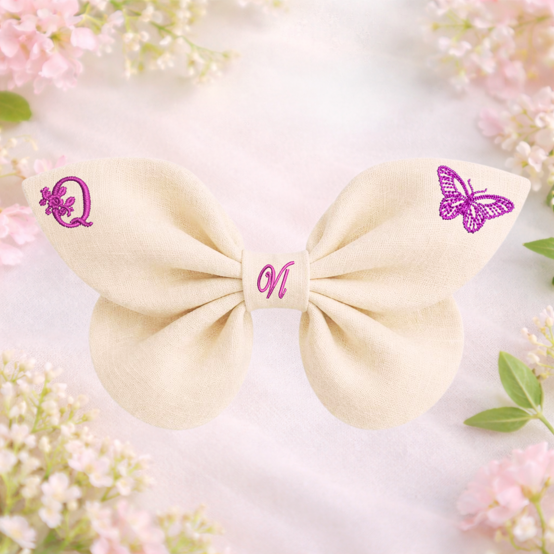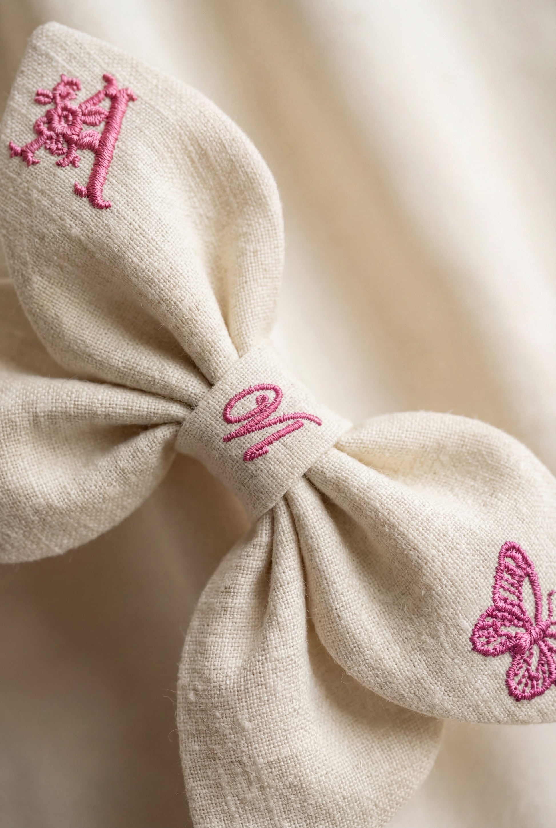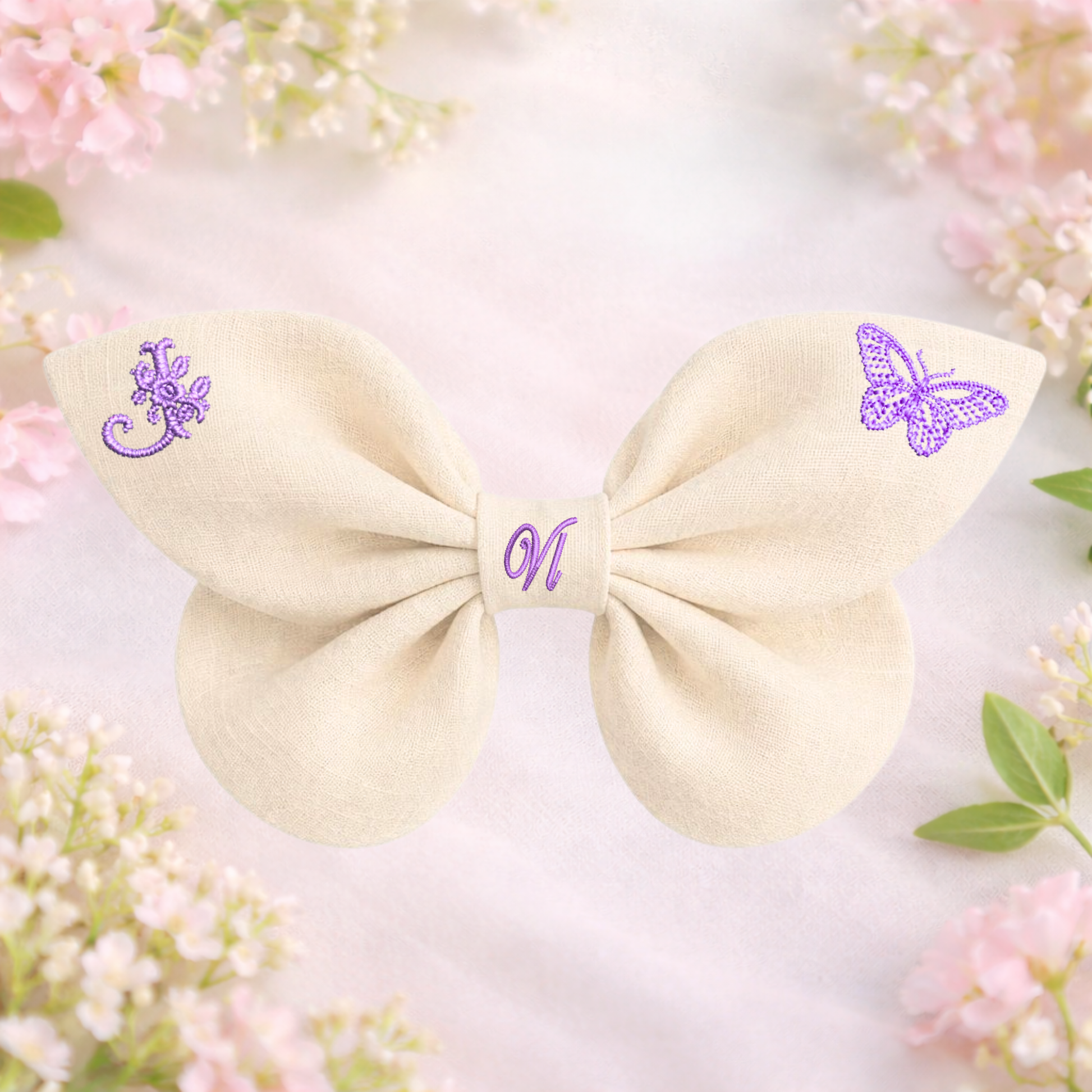 La texture naturale del lino dona al fiocco un aspetto morbido e autentico, mentre i dettagli ricamati aggiungono un tocco poetico ispirato alla primavera.