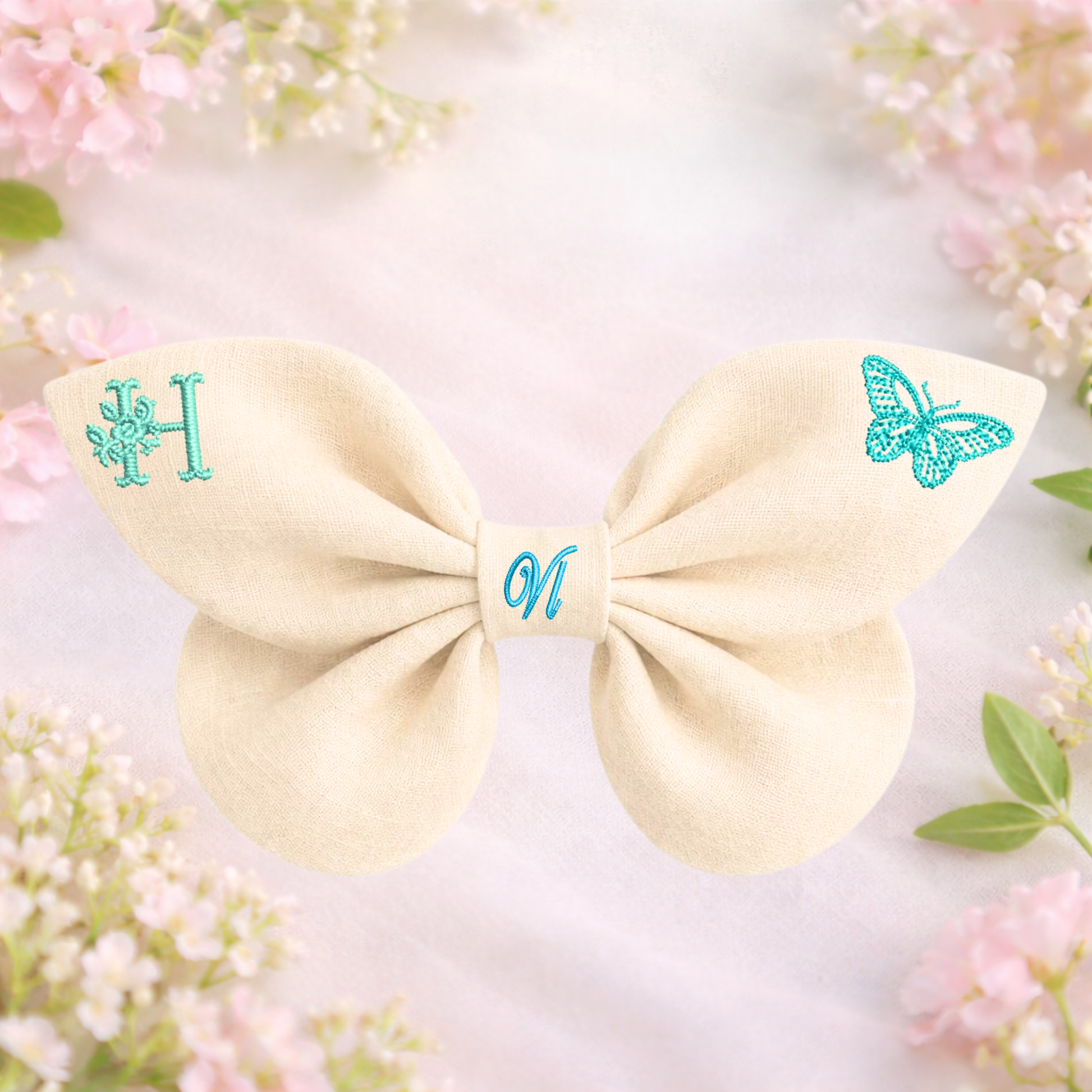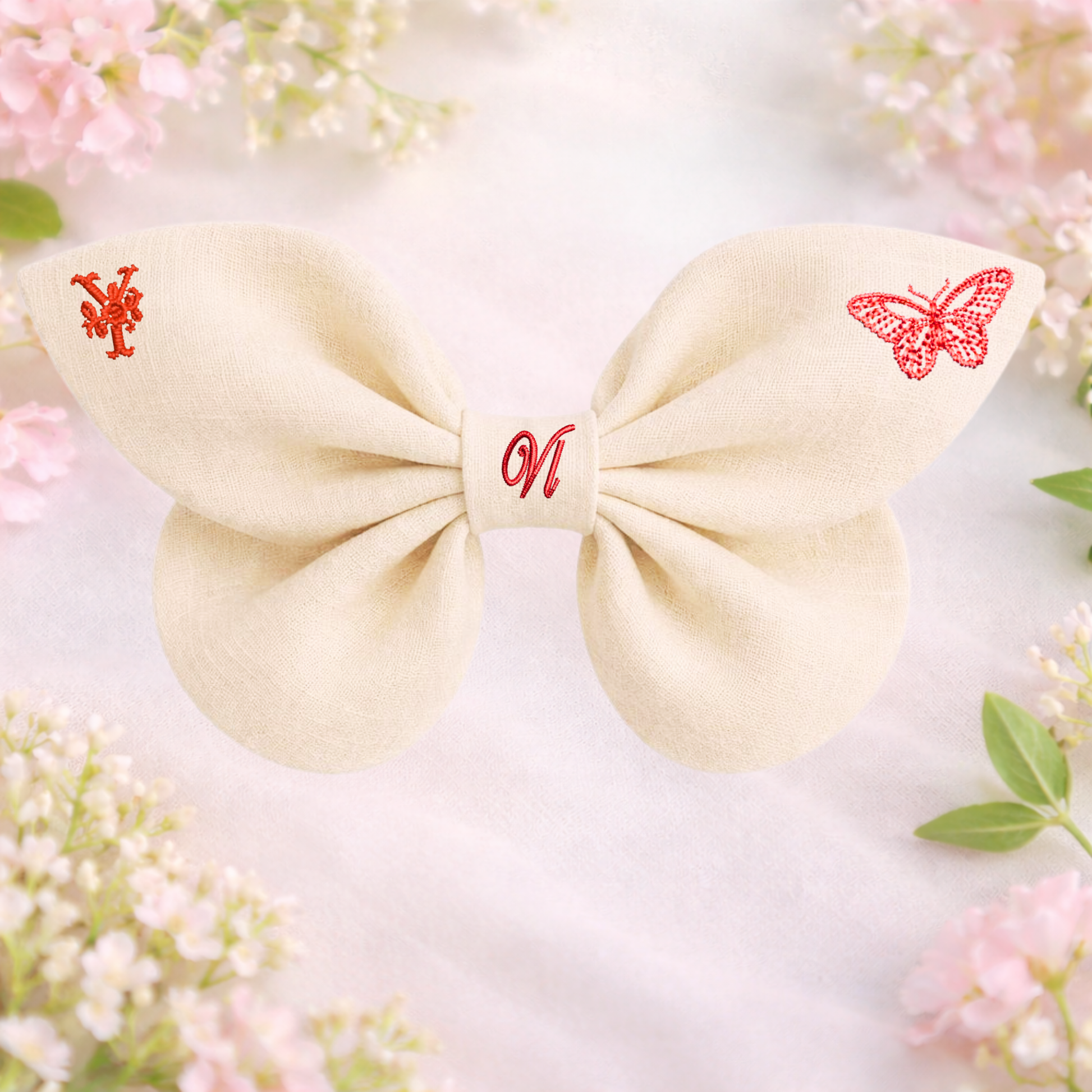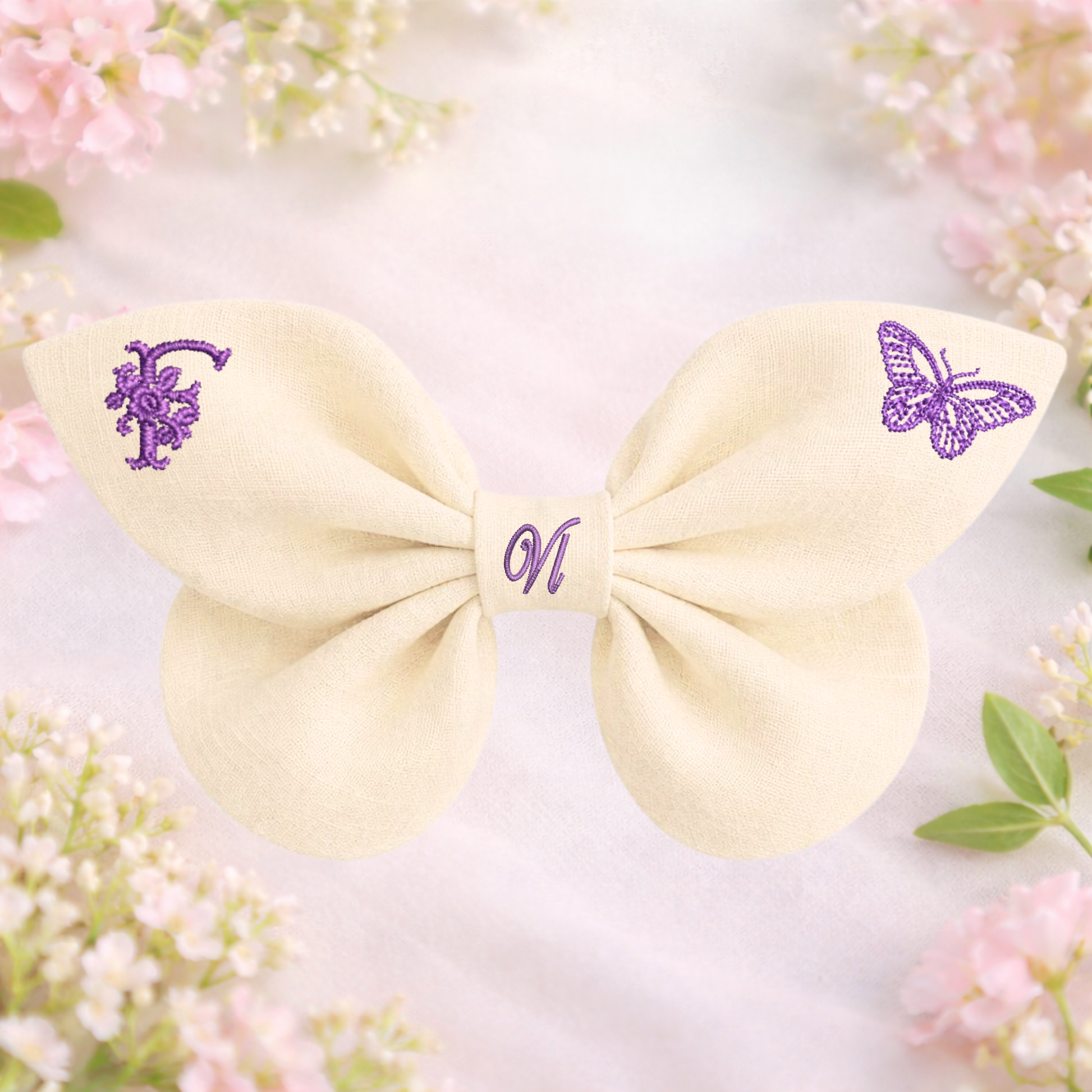 La texture naturale del lino dona al fiocco un aspetto morbido e autentico, mentre i dettagli ricamati aggiungono un tocco poetico ispirato alla primavera.