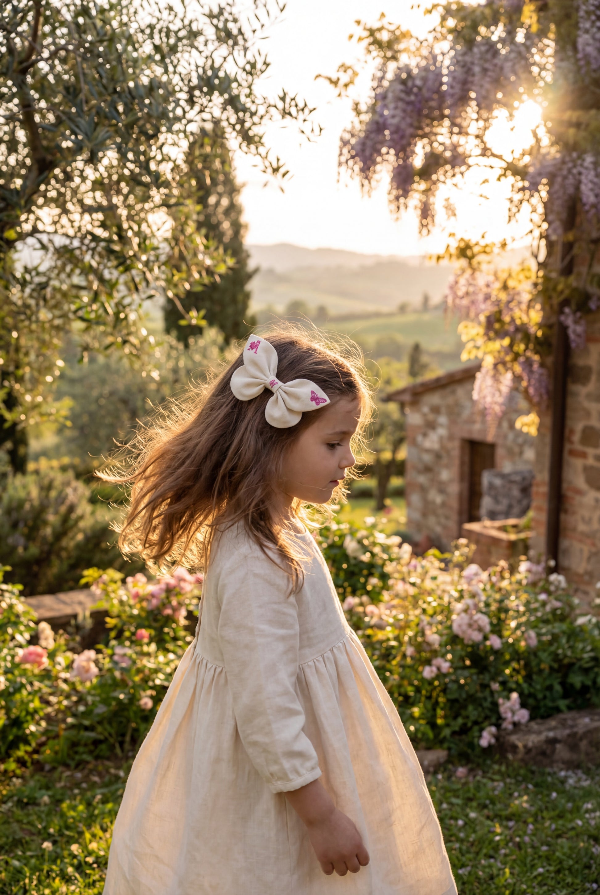 Elegante fiocco per capelli realizzato in lino naturale, impreziosito da delicati ricami: una farfalla e un monogramma decorativo. Il design unisce semplicità e raffinatezza, creando un accessorio leggero e romantico perfetto per bambine.
