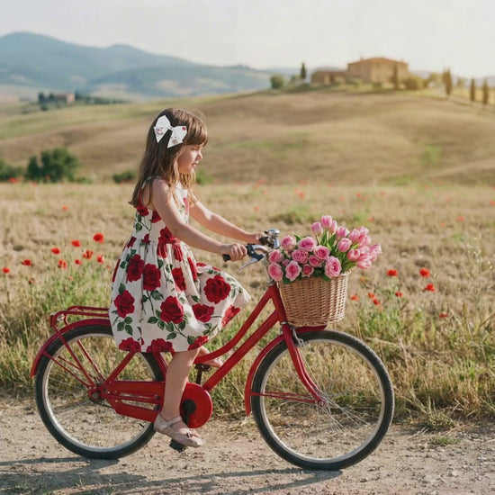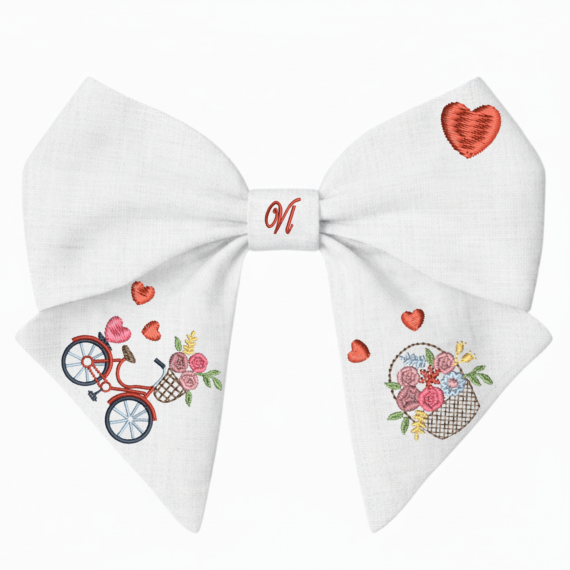 Fiocco in lino con ricamo “Bicicletta e fiori”. Collezione San Valentino