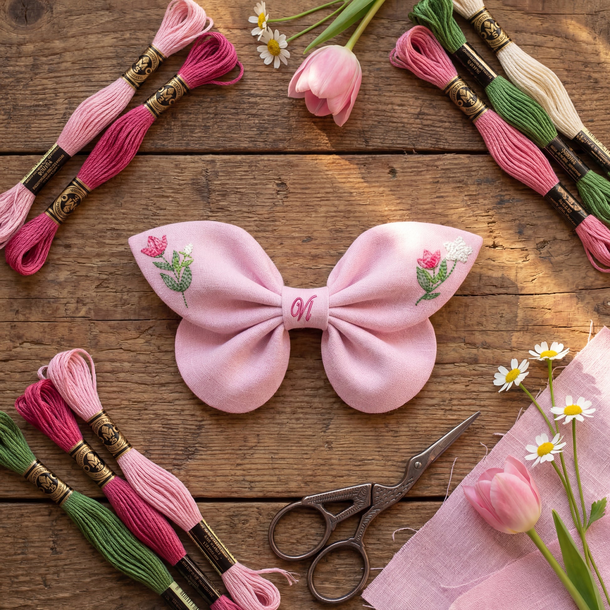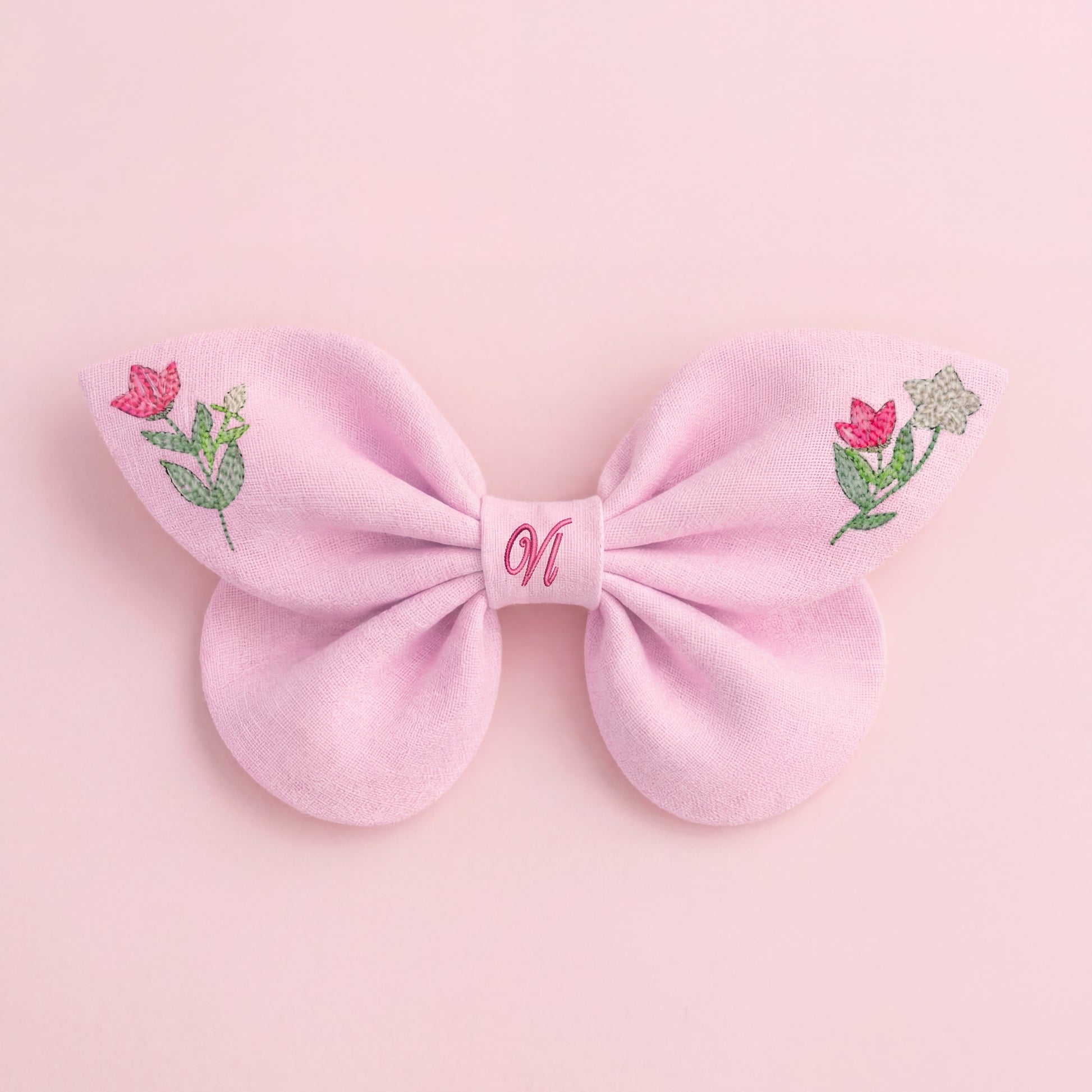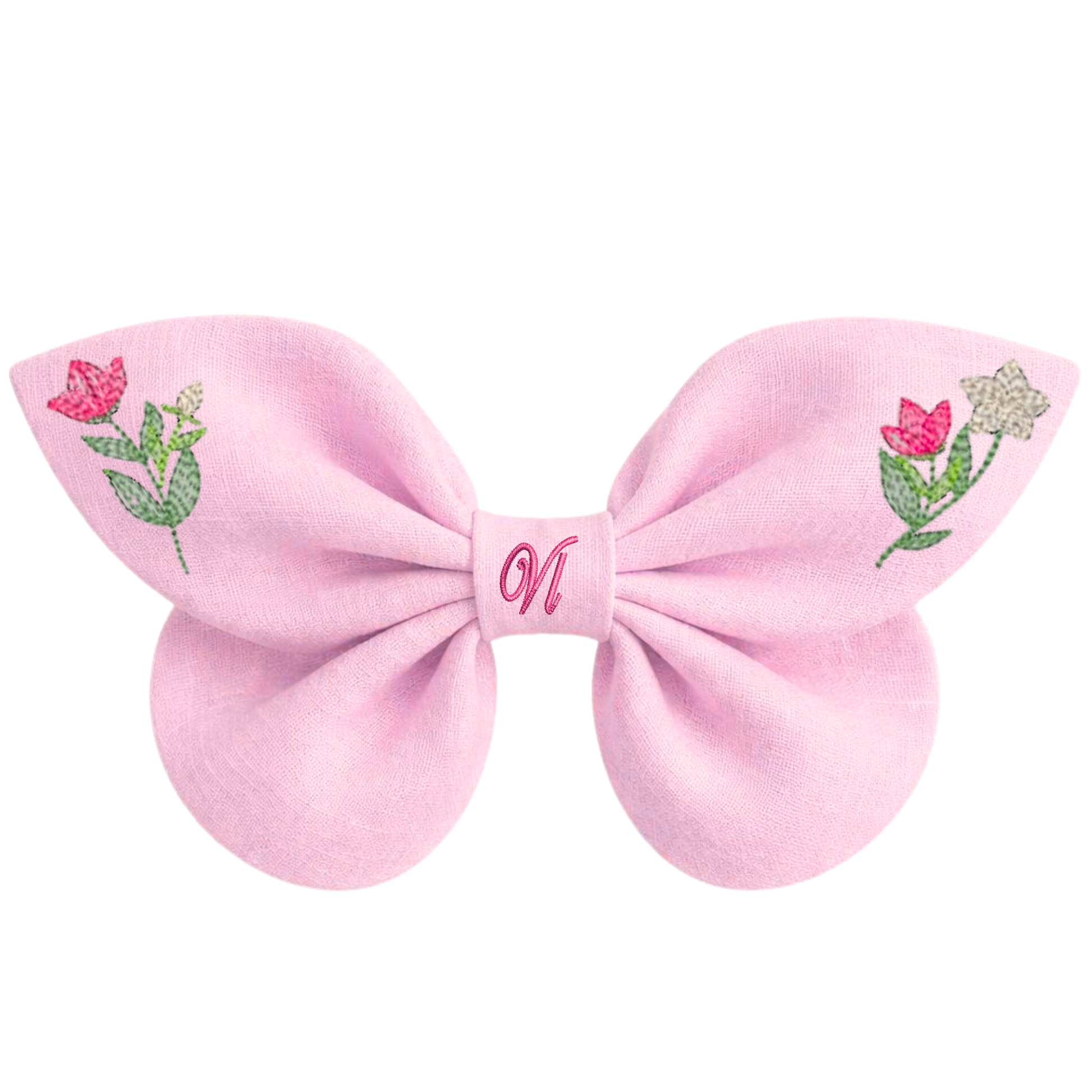 Eine zarte, himmelblaue Haarschleife aus Naturleinen, verziert mit einer exquisiten Stickerei: ein kleiner Kolibri und eine Frühlingsblume. In der Mitte macht ein gestickter Buchstabe jedes Stück zu einem Unikat.