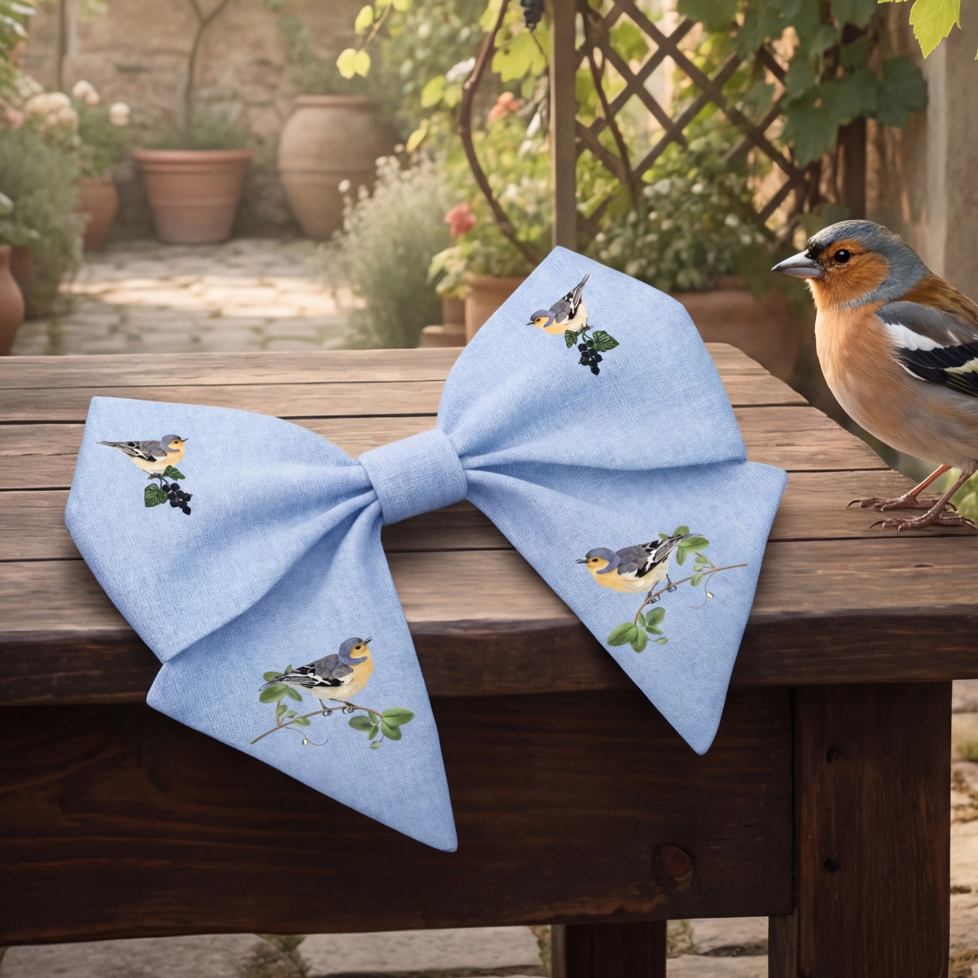 Elegante fiocco per capelli in lino naturale con delicata stampa di uccellini su rami. Un accessorio raffinato che unisce semplicità e carattere, perfetto per completare look romantici e quotidiani.